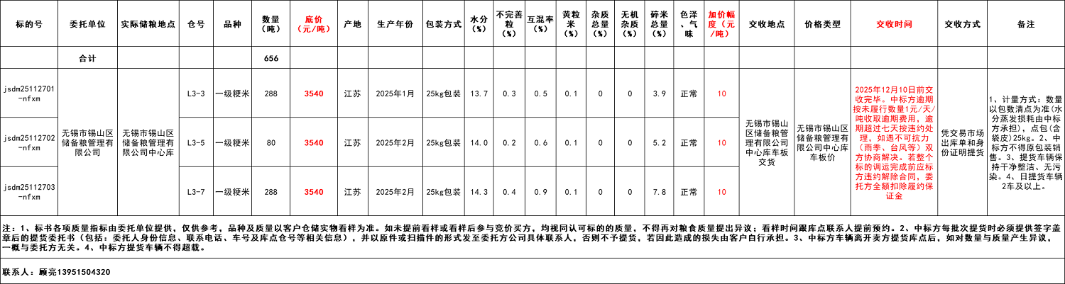 数量:656吨(其中2025年1月产一级粳米288吨;2025年2月产一级粳米368吨),分3个标段(详见交易清单)。