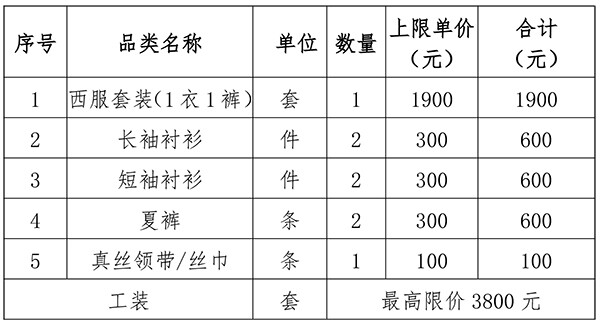 本项目为工装品类单价采购,工装最高限价3800元/套。每套工装包括西服套装(1衣1裤)、长袖衬衫(2件)、短袖衬衫(2件),夏裤(2条),领带/丝巾(1条)。采购数量预估75套,其中男48人、女27人,实际需求数量以采购人下单的数量为准,货款支付依据为成交单价乘以实际需求数量。