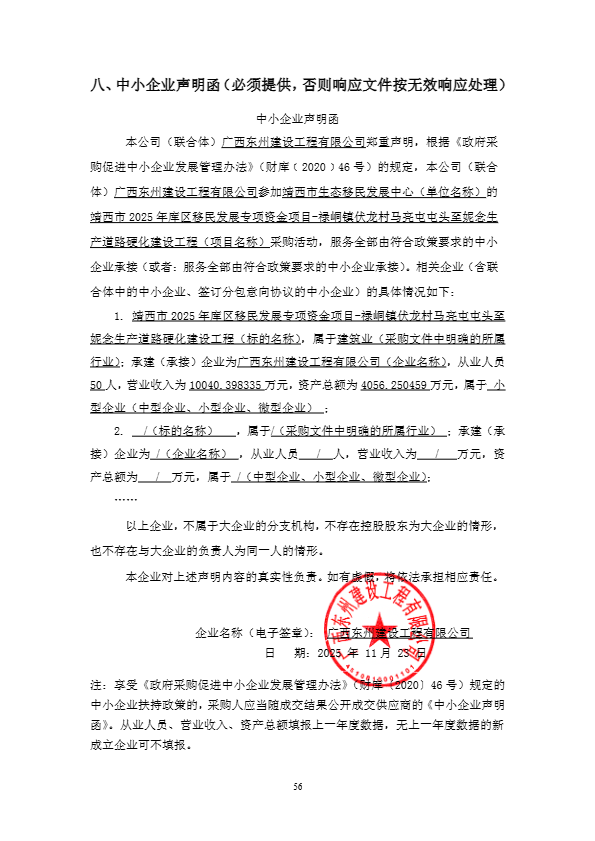 | 1 | 靖西市2025年库区移民发展专项资金项目-禄峒镇伏龙村马亮屯屯头至妮念生产道路硬化建设工程 | 靖西市2025年库区移民发展专项资金项目-禄峒镇伏龙村马亮屯屯头至妮念生产道路硬化建设工程 | 靖西市2025年库区移民发展专项资金项目-禄峒镇伏龙村马亮屯屯头至妮念生产道路硬化建设工程,主要建设内容:项目地点位于靖西市禄峒镇伏龙村马亮屯,设计路基宽度:4.5米,路面宽度:3.5米,8厚碎石垫层 18厚水泥混凝土路面;路线2:设计路基宽度:4.5米,路面宽度:3.5米,10cm砂石基层 12cm砂石面层等。(详见施工图纸及工程量清单包含的内容) | 90日历天 | 杨琪 | 桂******0862 |