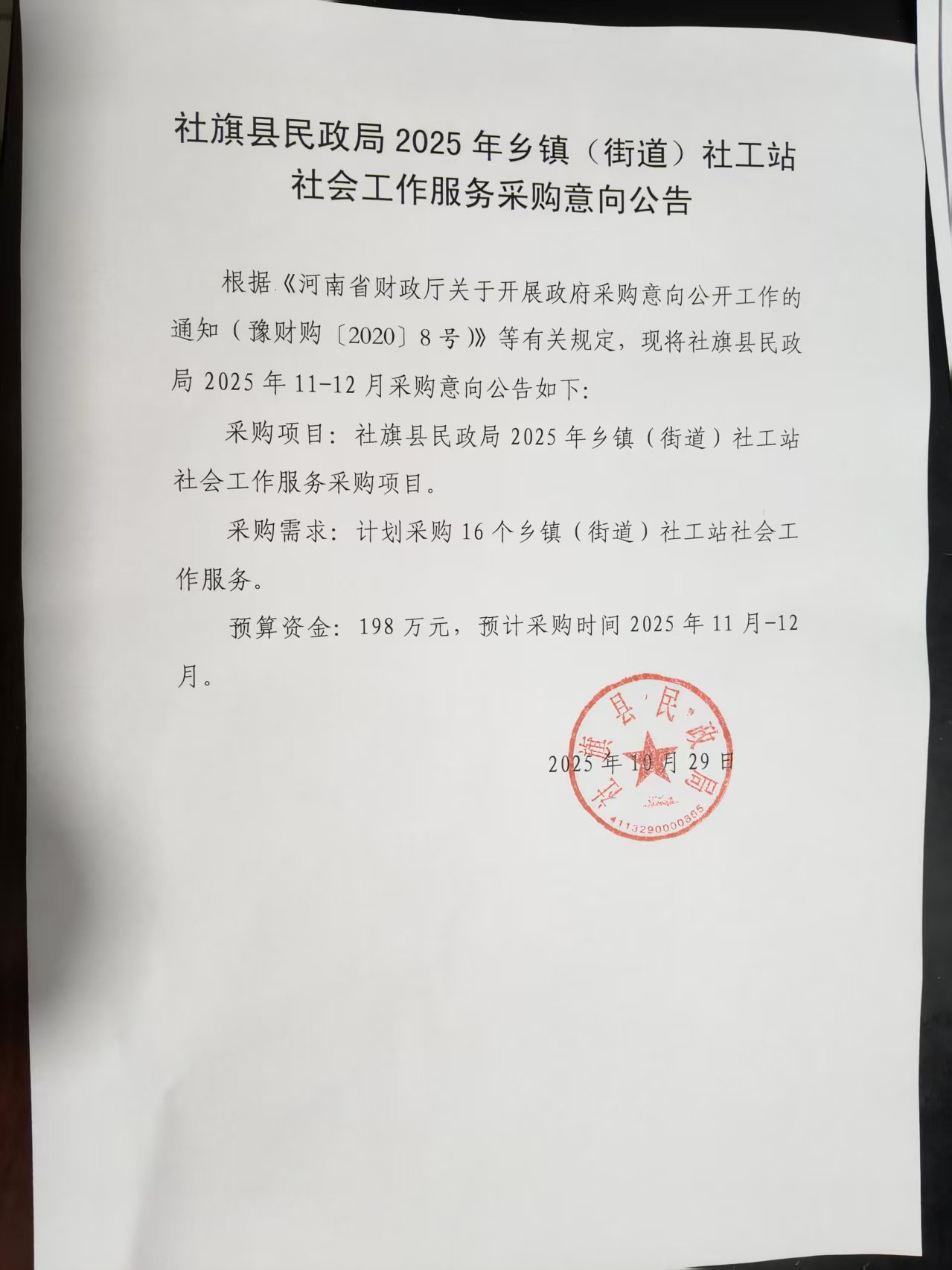 为便于供应商及时了解政府采购信息,根据《河南省财政厅关于开展政府采购意向公开工作的通知》(豫财购〔2020〕8号)等有关规定,现将社旗县民政局 2025年10(至)12月采购意向公开如下: |