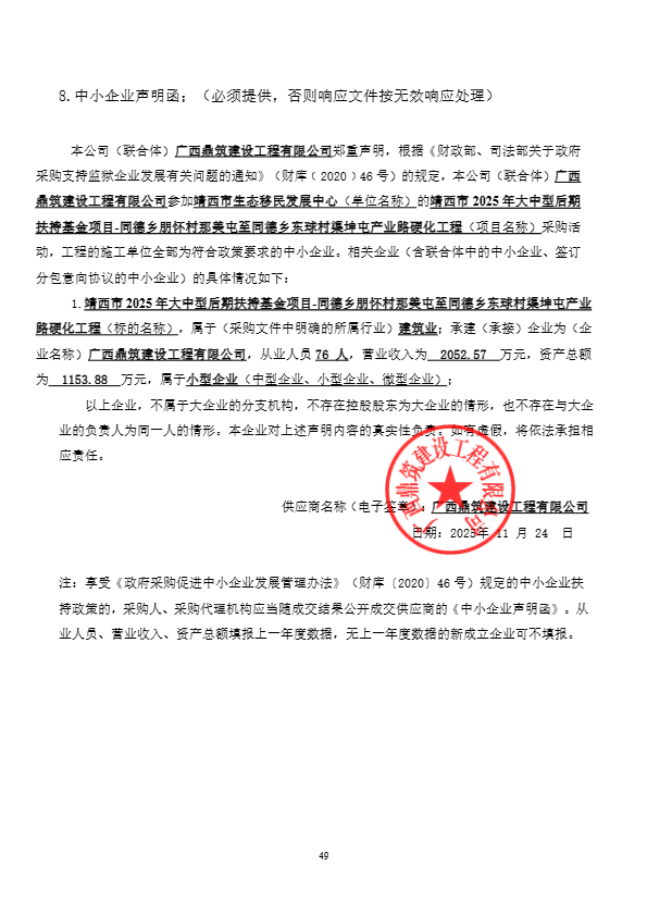 | 1 | 靖西市2025年大中型后期扶持基金项目-同德乡朋怀村那美屯至同德乡东球村渠坤屯产业路硬化工程 | 靖西市2025年大中型后期扶持基金项目-同德乡朋怀村那美屯至同德乡东球村渠坤屯产业路硬化工程 | 靖西市2025年大中型后期扶持基金项目-同德乡朋怀村那美屯至同德乡东球村渠坤屯产业路硬化工程1项。(详见施工图纸及工程量清单包含的内容) | 90日历天 | 黄德权 | 桂******1370 |